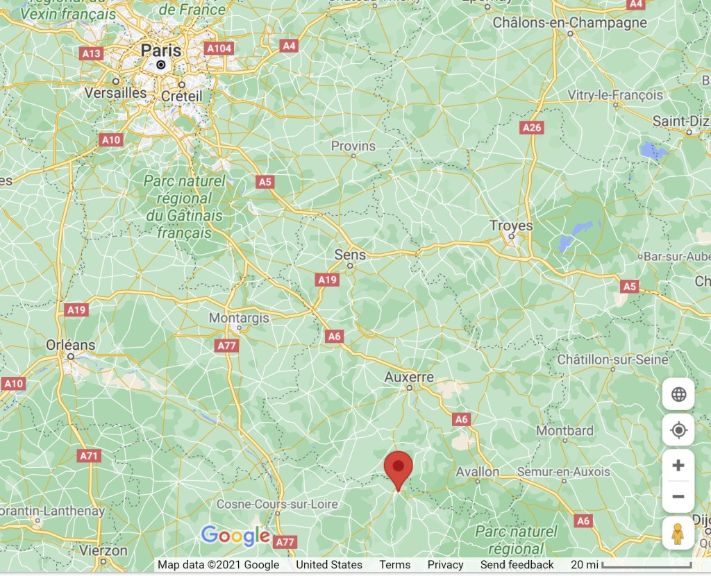 Here is an aerial photo of the town; it is at the confluence of the Yonne and Beuvron rivers. Read more about it on the Wikipedia page. Please remember that Wikipedia will tell you that it is not a reliable source, so do not use it as a reference for any scholarly materials. (This blog falls well short of scholarly…I personally am hoping for nearly cogent).