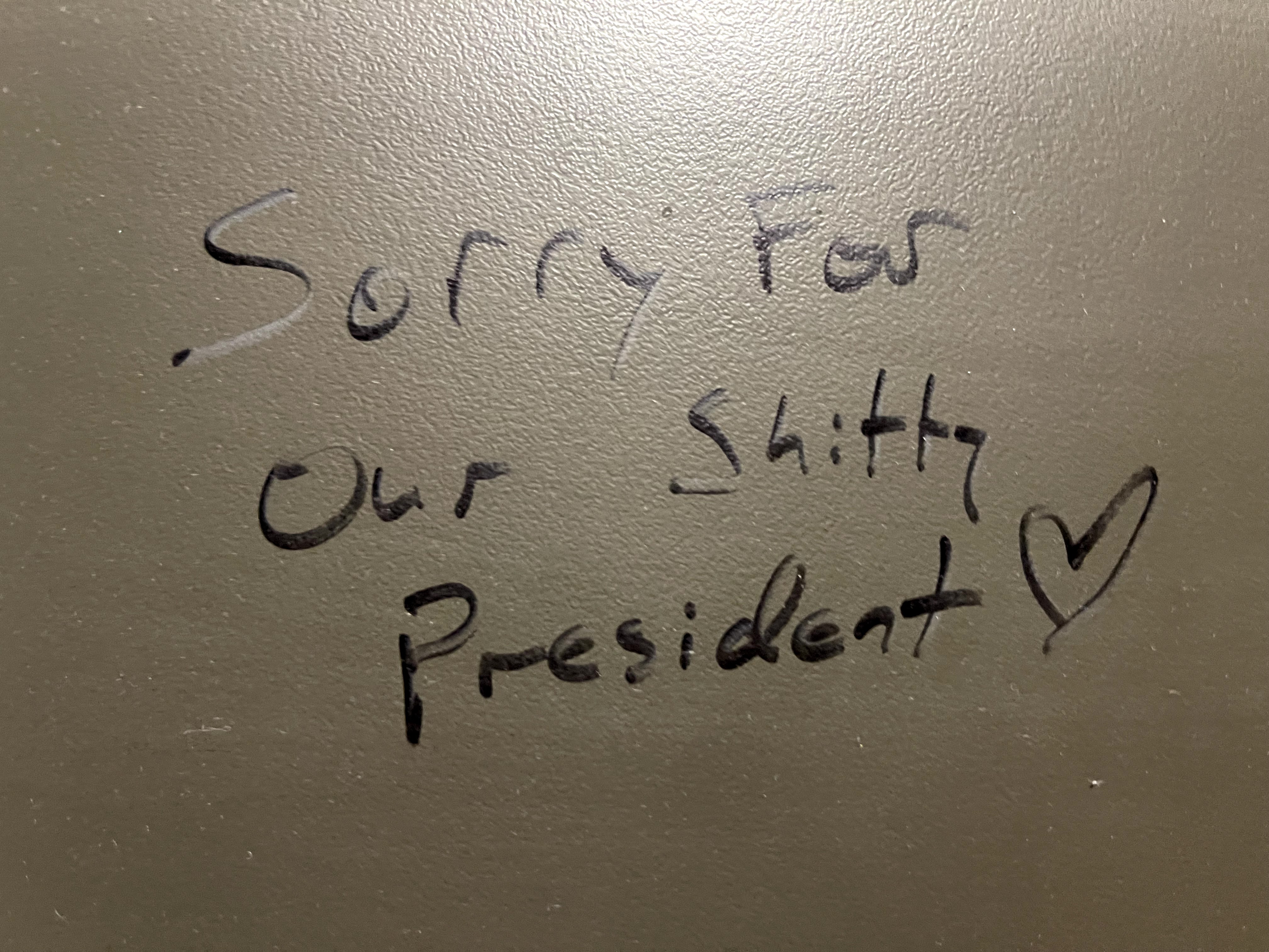 Steven thinks the apology at right, which was written on the bathroom wall at the catacombs, was penned by a French person about Emmanuel Macron. I mean, our dental hygienist (in Maryland) did explain to me that he was the antichrist. Something about Emmanuel meaning G-d is with us but Macron meaning he who values power over love. To be honest, I mostly stopped listening after the word antichrist, but I think that was the gist. I say it’s an American apology that’s been there since the president who shall remain nameless. What do you think?