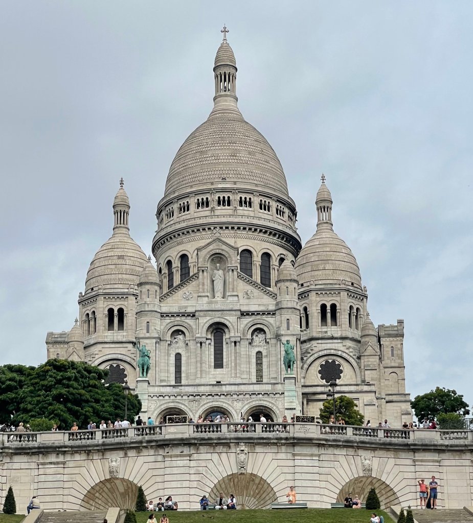 We continued our walk up to Sacré-Cœur, the highest point in Paris at the not-very-high 122m. It is mostly a very gentle uphill, but near the end it gets a bit steep. We found this installation, which, according to Atlas Obscura, is a reference to the book “Le Passe-Muraille”. The area around the basilica is tourist central and we fought through the August crowds and headed for the overlooks so that Sue could get some photos. Once she had her fill, we headed down the steps and away from the crowds.