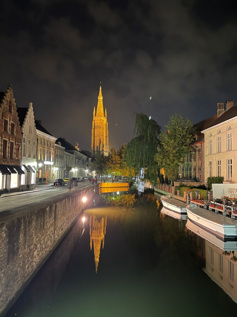 After dinner we had a wander through the now nearly deserted town and it was wonderful. The canals are gorgeous, the buildings and architecture great. It was such a different experience than only a few hours earlier. (When we arrived, I fear both of us were thinking that Brugge was a bust. We liked it much better when it didn’t resemble Time Square.)