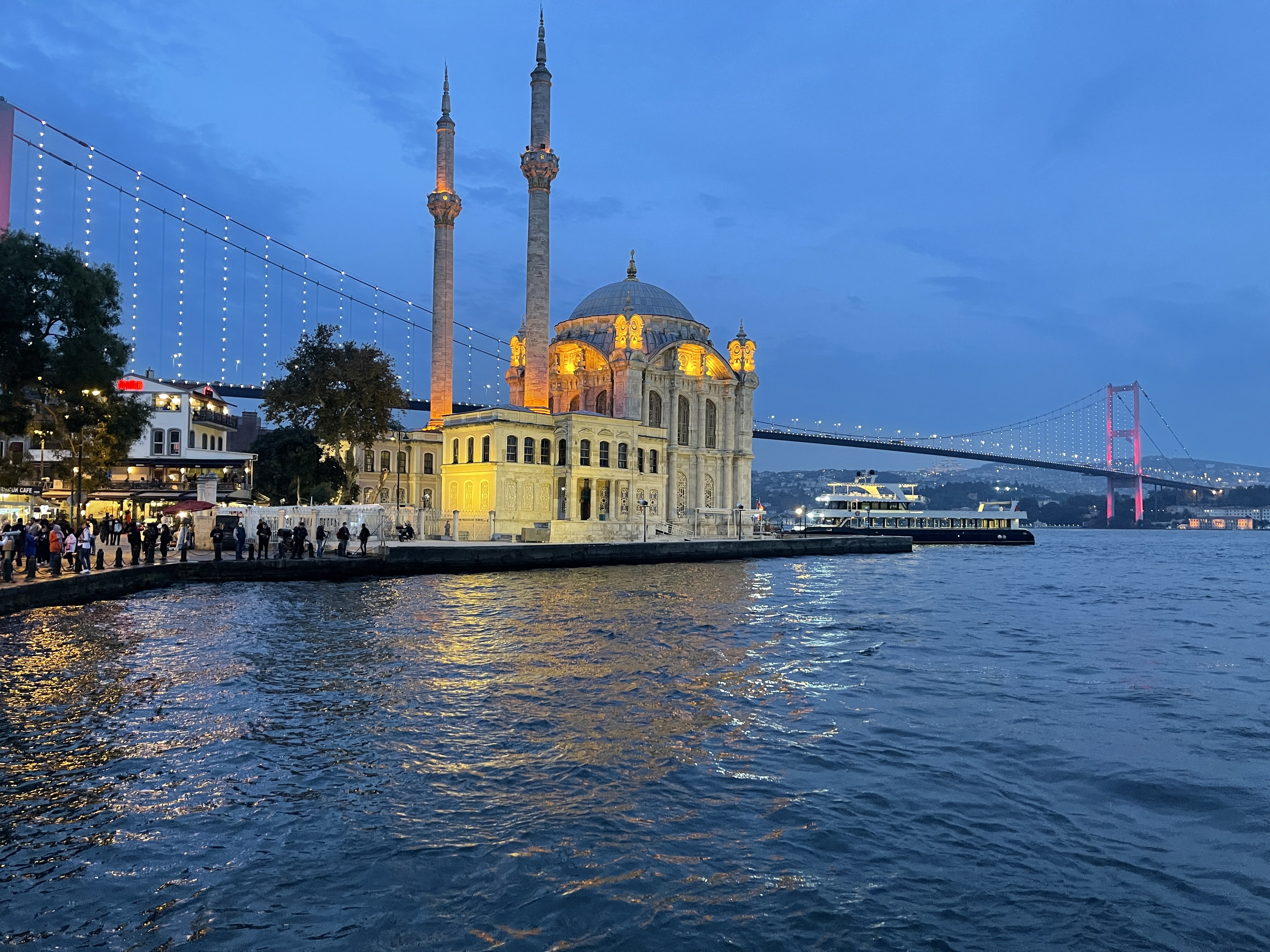Once we had finished poking around, we headed to the Ortaköy mosque. Sue’s friend, Dana, recommended seeing the mosque, which is also built on the waterfront, and then eating kumpir from one of the food stands. We figured it was only a “short” 3km walk so we thought it would be a nice stroll along the waterfront. The walk was nice, but like everywhere in Istanbul, it was very crowded. We arrived at the mosque at about 5. .pm, went inside for a quick look and then decided to have a drink and a short rest. We bought freshly squeezed pomegranate juice from a stand outside the mosque and sat down on a bench. Neither of us was particularly hungry but the next thing on our agenda was to eat kumpir. We wandered around the town for an hour or so and then decided to head back to the AirBnB. We just weren’t hungry enough to eat and there didn’t seem to be a good reason to stick around for another hour or so.