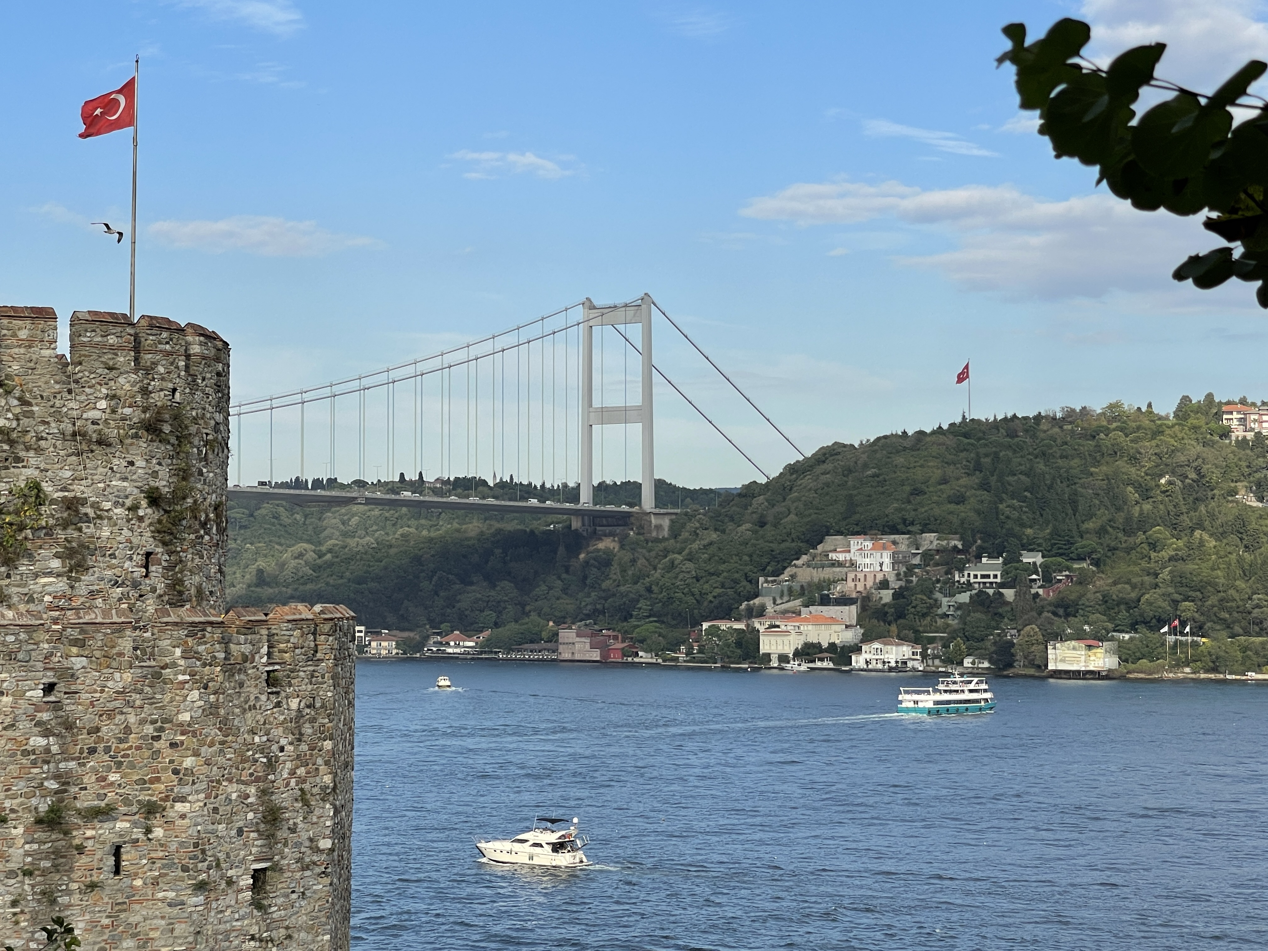 After a couple of hours in the museum we decided to walk about 30 minutes to the fortress. The walk was really pleasant. It was mostly flat (YAY!) and along the waterfront. The fort was the first incursion by the Ottoman Empire into Europe. It was built in 1452 in order to facilitate the siege of Constantinople. Amazingly it was built over a four-month period and it is situated in the narrowest point of the straits. The ramparts and towers were closed for renovations, but we wandered the gardens and climbed up to the top of the inside of the fort. The views over the straits were amazing.