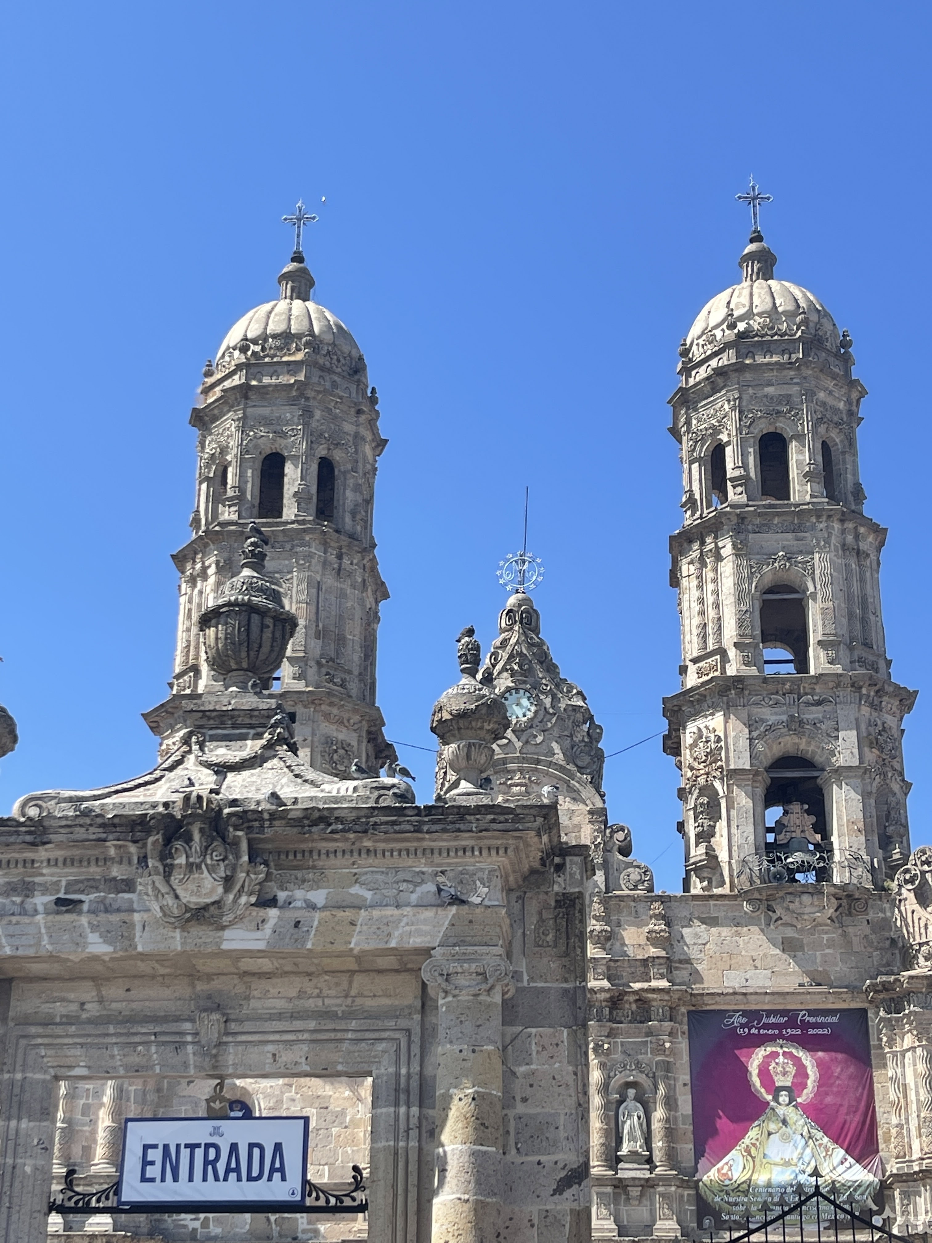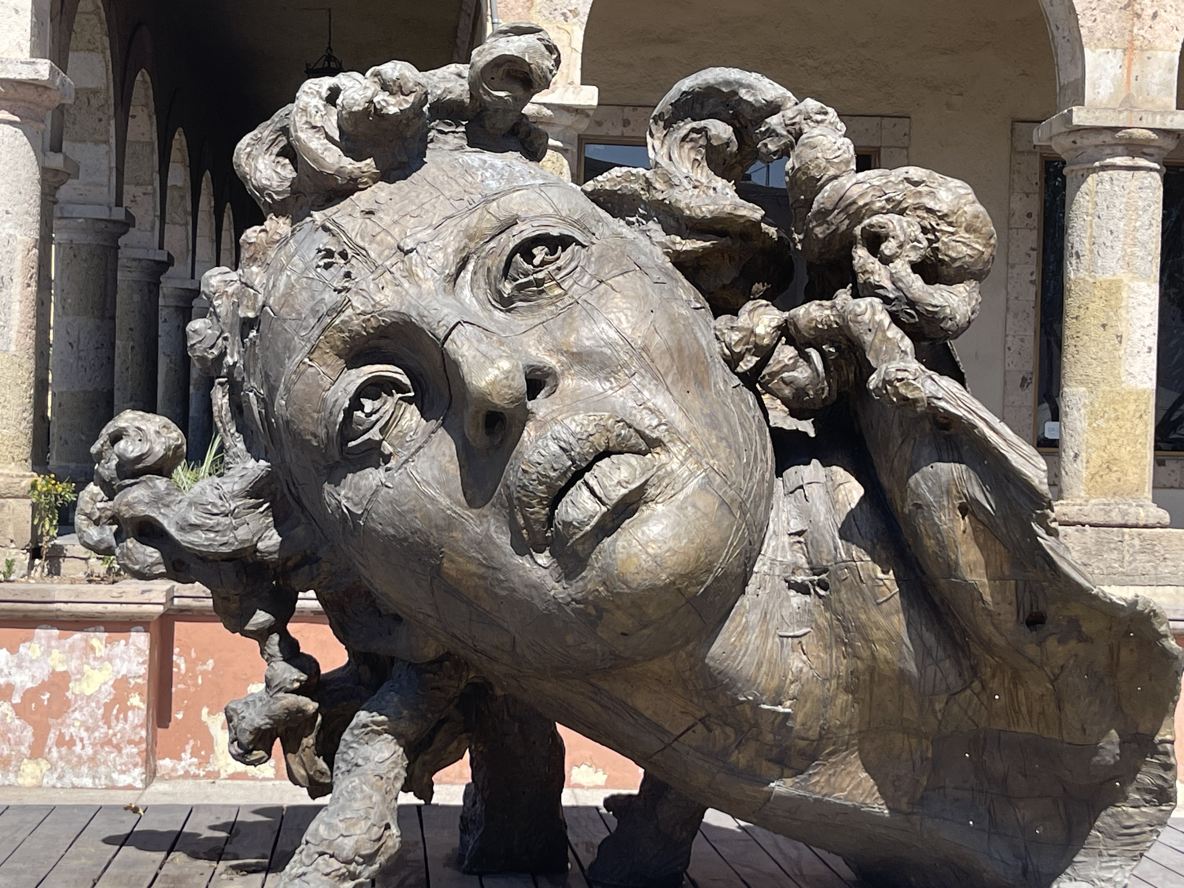 On Saturday morning we grabbed breakfast across the street at Pata de Elefante. They have wonderful breakfasts, and Sue and I indulged. They had a two piece band (guitar and saxophone) playing in the corner and it enjoyed a quiet morning. Afterwards, we headed to Zapopan which is a city that abuts Guadalajara, and it is really just another neighborhood of the greater Guadalajara area. We went there to go to the local modern art museum with our friends Doug and Kenta. We biked to their place and they drove us to Zapopan. It has a nice little downtown and a large church that looks like it should be a few hundred years older than it is. Perhaps we are spoiled from our wanderings in France and Turkey, but a church built is the 17th century seems a bit new. We didn’t go in as it seemed like quite a production so we took some photos from the outside, nodded our heads that we had seen it and headed for the museum.