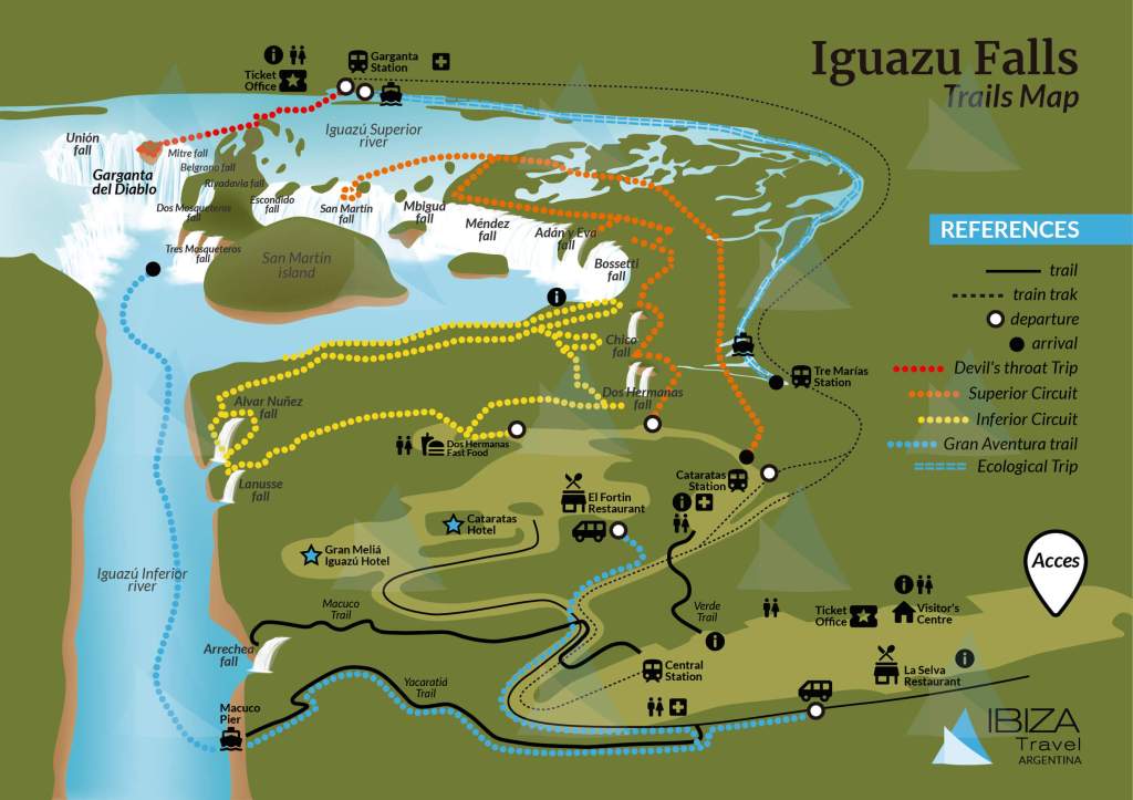 A map of the Argentine side for reference. The yellow is the lower trail; the orange is the upper trail; the blue is the boat ride; the red, which the Devil’s Throat bridge, was washed away by the flood.