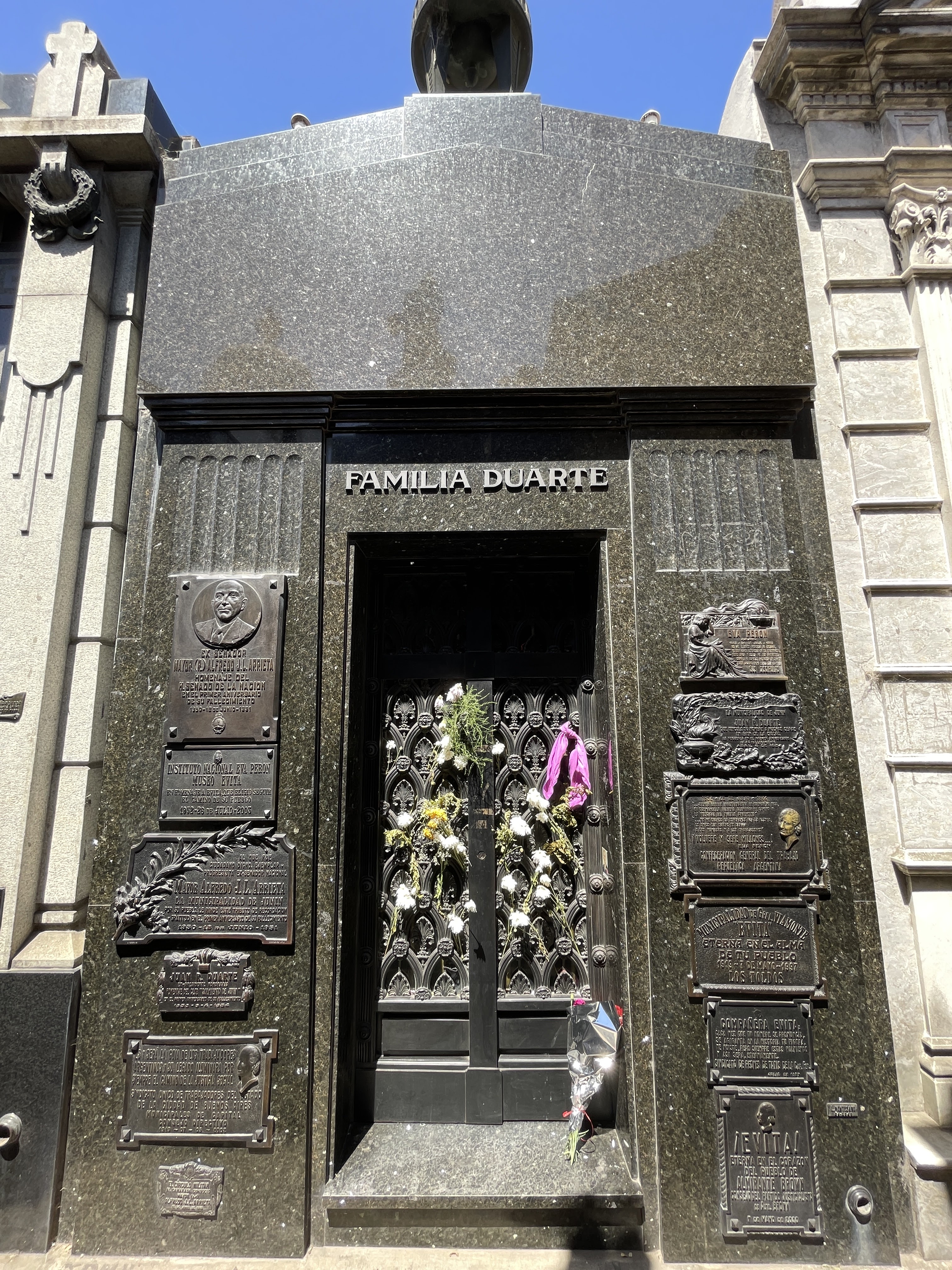 The cemetery is all paved and originally we thought it was all above ground. It is full of grand mausoleums, but some of the graves are underground (some you can look in and see the coffins, others you see stairs going down). Anyway, being unfortunate enough not to be Argentinian (we must have done something bad in a previous life), we didn’t really know anyone else to visit besides Evita, but we wandered around anyway because there were many cool photos to be taken (Apparently before she was interred in her family’s crypt, her body had a unusual time — including being displayed in her husband’s dining room for a while — read about it here).