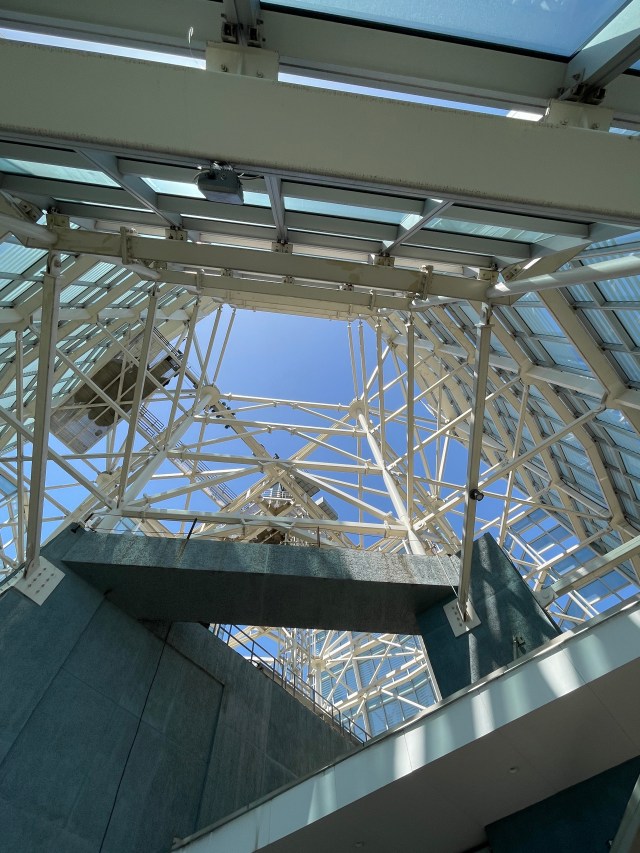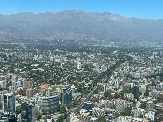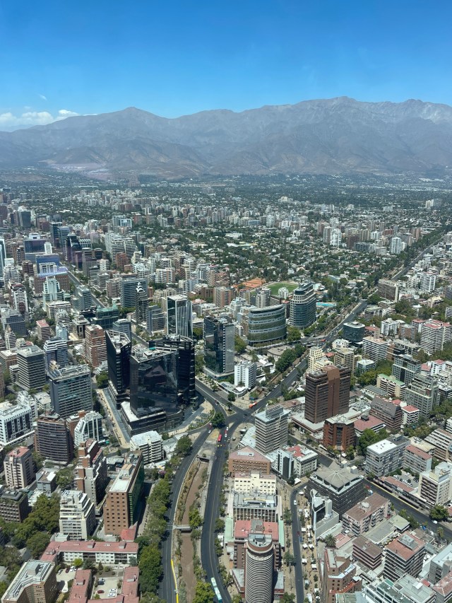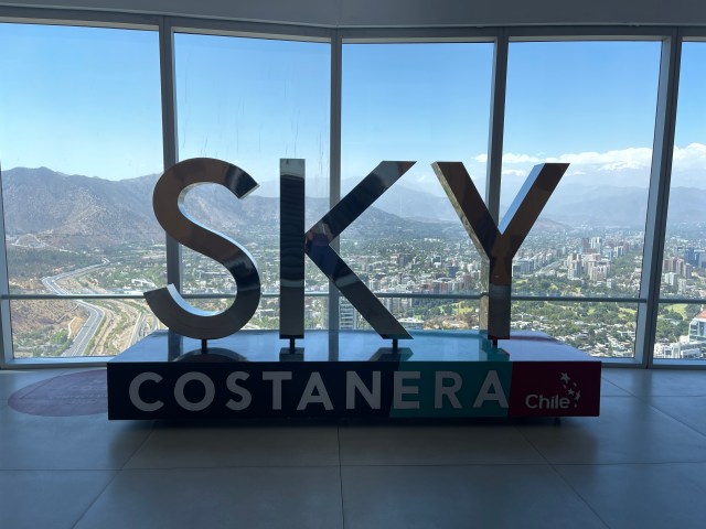 The Costanera Center has two attractions. First, at 300 meters, it is the tallest building in Latin America. They have a viewing deck at the top, the 62nd floor, that is glassed in, but open to the sky. As we all remember, heights are not my favorite thing, but I strapped on my big boy boots and we headed up the stairs – only kidding – we got into the elevator. The view is pretty astounding. There are very few buildings higher than 10 floors, and Santiago is surrounded by mountains. I will let the photos do the talking.