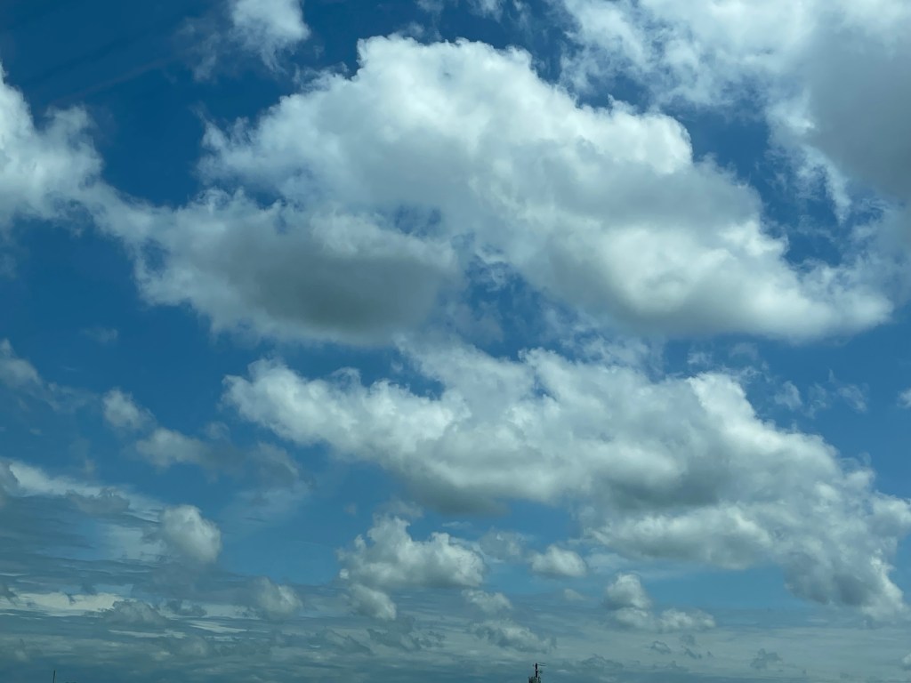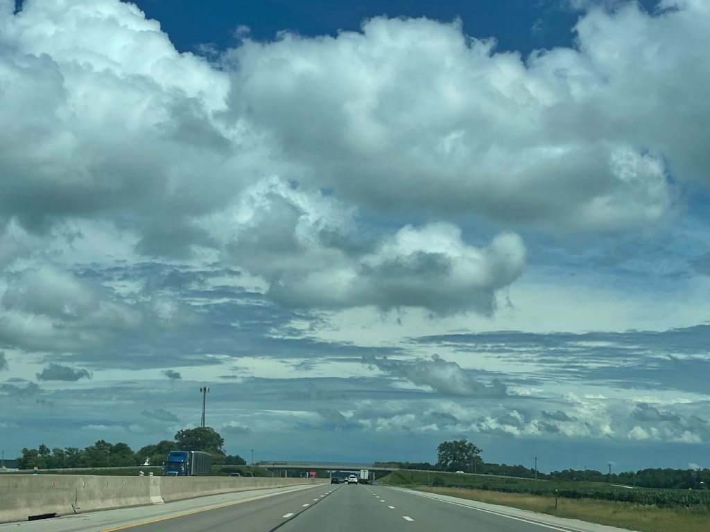 The photos below are some random shots from the road. Notice how flat the road is in the first photo – the first 7 hours of the drive are pretty much like that. But the clouds are pretty.
