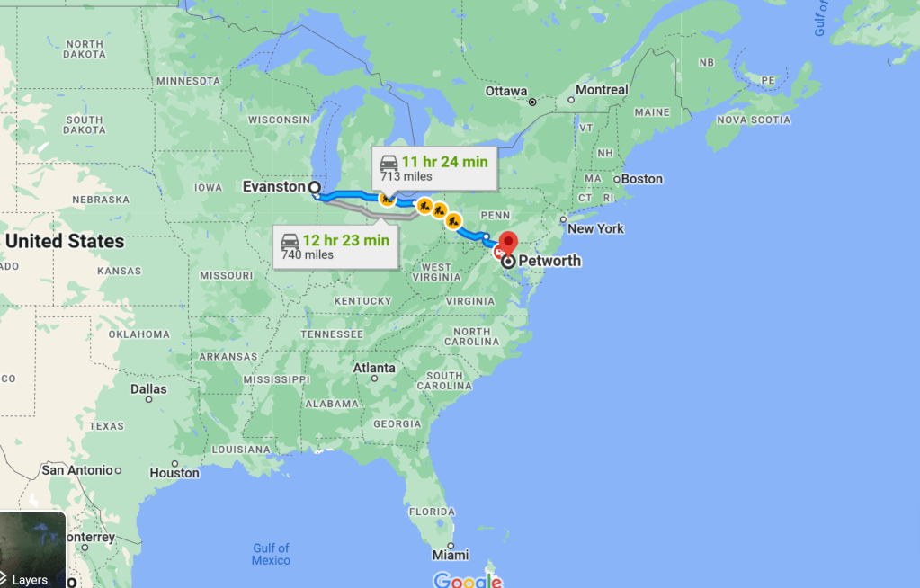 The plan for Sunday was to get up, hit the road between 9 and 10, which should put us at our AirBnB in Washington at about between 1 and 2 (for those of you who are math challenged that means the trip would be about four hours. We woke up late, in part due to the change in time zones, had what seemed like an interminable wait for a cup of coffee at Starbucks and then hit the road. The weather got steadily worse over the first hour or so and by the time we stopped for gas two hours in, it was pouring. Sue took over driving for the second half of the trip and boy did she get the worse end of that bargain. The rain went from steady to heavy to pouring for the rest of the trip. The traffic was heavy and moved, most of the time, but it mostly moved slowly, and we ended up averaging about 40 miles an hour for the next 4 hours. It was awful, but Sue was brilliant. There was only a minute or so when I couldn’t see the car ahead of me.
