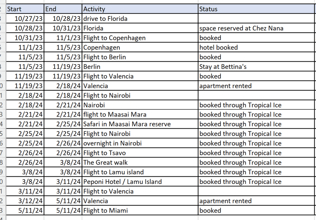 Our plan for the next 6 months beginning in November is to head to Valencia by way of Copenhagen and Berlin with a three week safari in Kenya in February. As always, I have created my travel spreadsheet that keeps track of what we have/haven’t taken care of. Last Saturday this is how it looked: