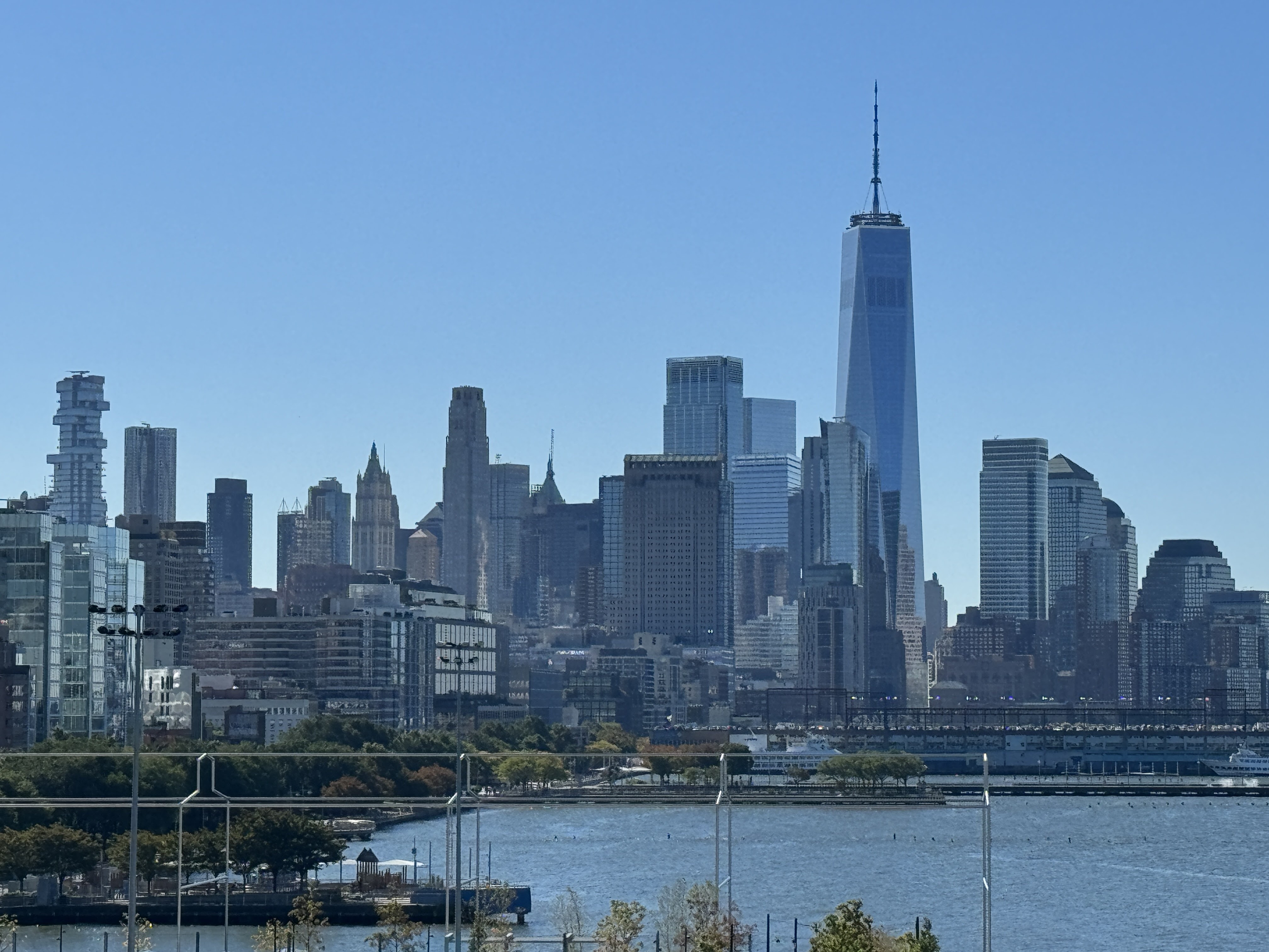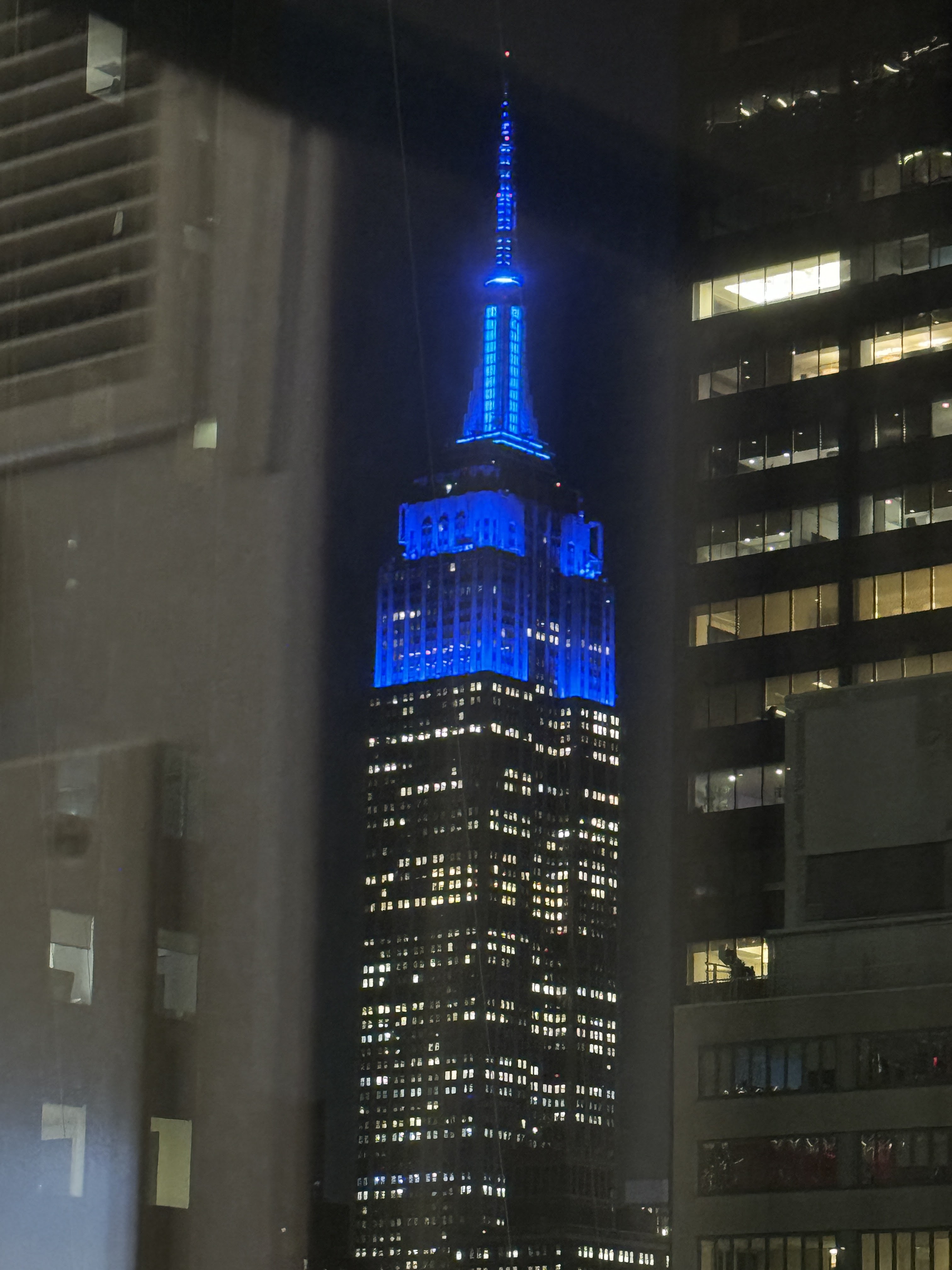 We walked around for a bit and Steven had pizza. For some reason, I wasn’t in the mood for pizza so instead I had a falafel sandwich from a food truck. It was OK. I cannot believe I was in NY and didn’t eat any pizza (clearly the sign of either derangement or dementia). Something is definitely wrong with me. I didn’t have a bagel either (I did!). Double weird. Wednesday night, we noticed that quite a few buildings were lit up in blue and white, although we also witnessed a Palestinian protest (very peaceful) from our hotel on Friday. I’ll refrain from commenting any further since this is a casual blog.