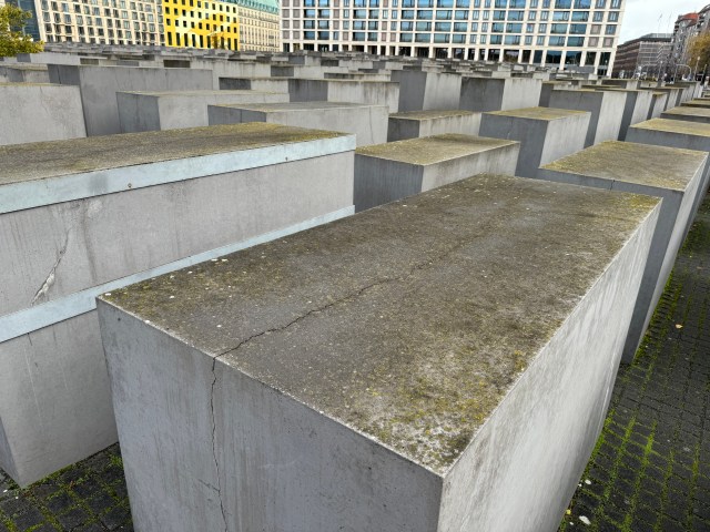 Death march? Nah, but close enough (I think she made sure each of the days were juuuuusssst less than 10 miles so I couldn’t whine that it was a death march. She is very tricky). Steven hadn’t seen the Brandenberg Gate and surrounding area, which I had seen on my photo tour, so we decided to take the U-Bahn (the underground/metro/subway) to Potsdammer Platz (mostly because we knew how to get there) and then start walking. We got to the Memorial to the Murdered Jews of Europe (aka Holocaust Memorial) first. It is a series of different size stele laid out in a grid. Underneath, there is a museum that relates the history of the Holocaust. None of it is news to us, but it is particularly distressing given the state of the world now.