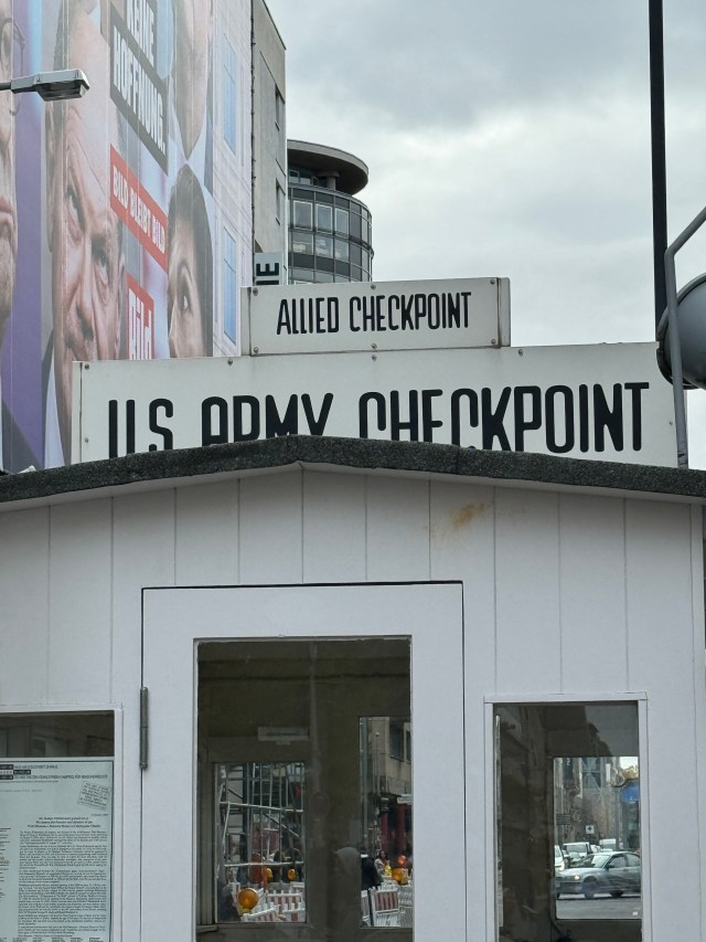 From there, we walked through the Brandenberg Gate and off to Checkpoint Charlie. We lasted about a nanosecond – it is very touristy and everyone has to pose in front of it. I guess it’s a must-see, but it’s not really our thing.