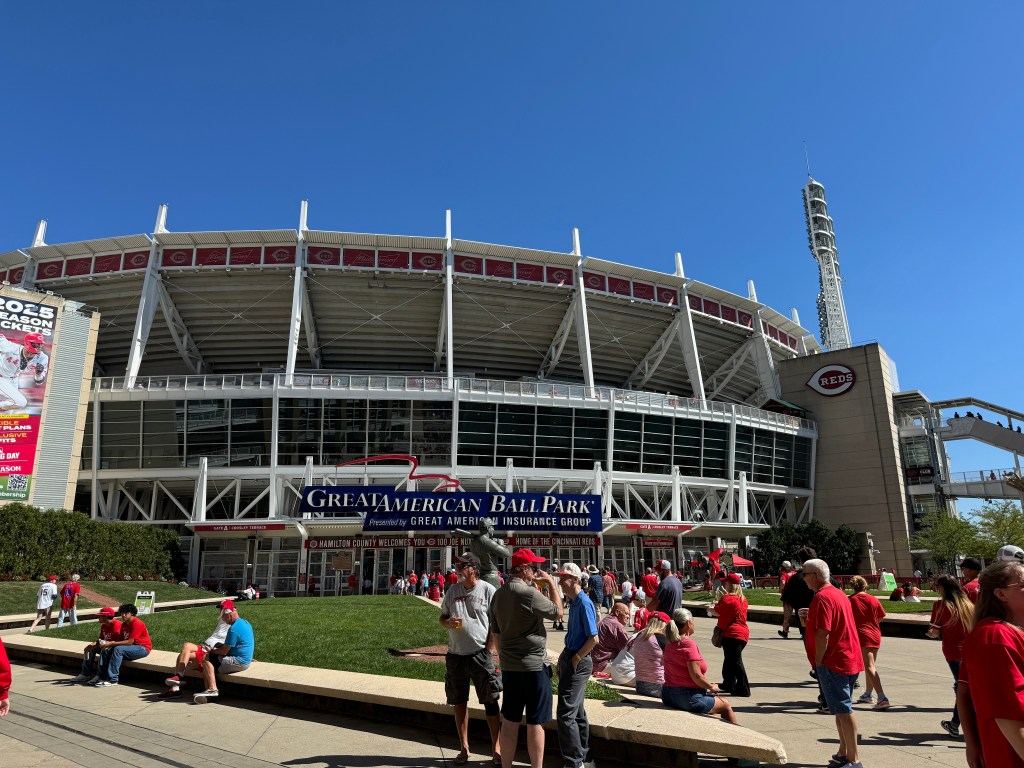Our plan B was a five-hour drive to Cincinnati to catch a Labor Day Reds-Astros game. We packed the car and headed out. We arrived with just enough time to freshen up and walk over to Great American Ball Park. It was a perfect afternoon for a game and it was a fun game. We sat in the second section up behind home plate. Great seats! The three little boys in front of us were the best cheering section possible and one of them was doing everything possible to get on the Jumbotron. His dad told us he’d been on it several times that season already. Sadly, our game was not one of those times. Happily, the Reds won 5-3.