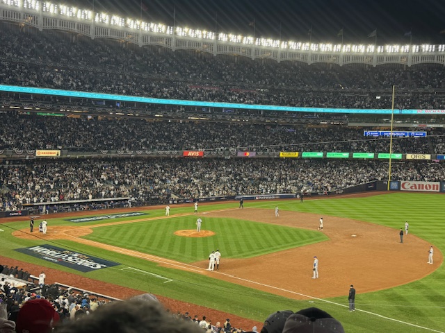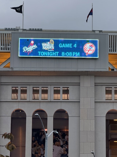 I, on the other hand, got cross something off my bucket list and to go to a World Series game (for those of you who do not know baseball, the World Series – despite its name – is the championship for the U.S. professional baseball league). My favorite team, the New York Yankees (booooo!), were playing the Los Angeles Dodgers (also boo, but not as many o’s) (The Dodgers were originally another New York team, but they moved to LA in 1958.) The World Series is a best of seven game series and I went to the fourth game.