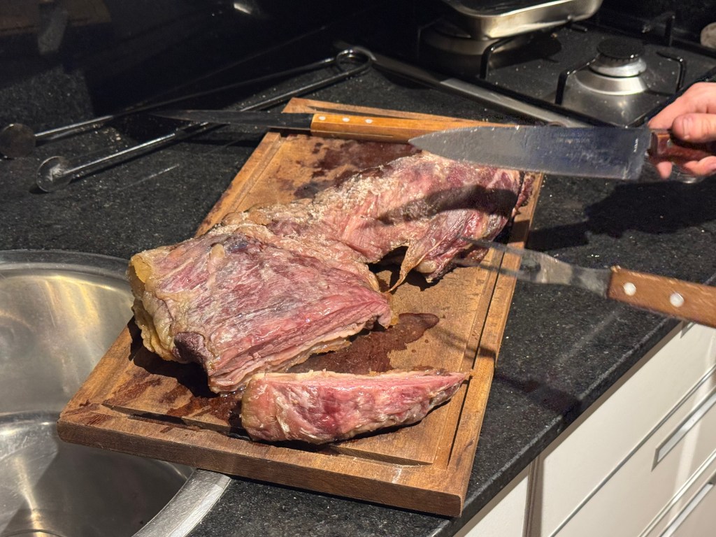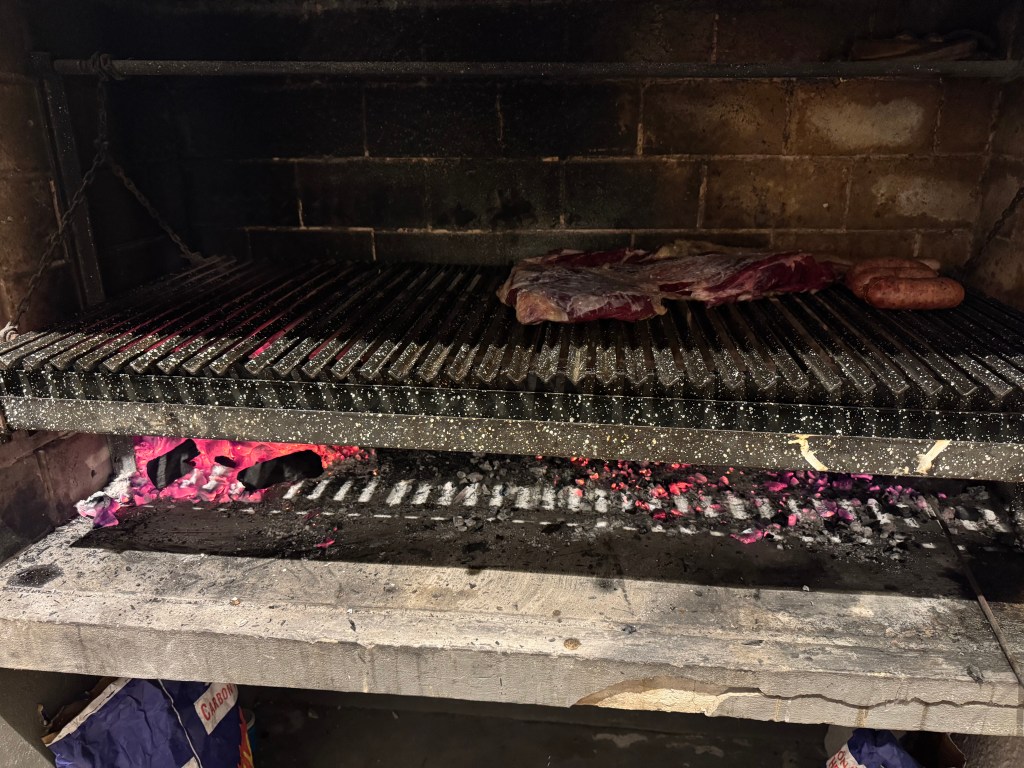 About 10:30, the meat and Susan’s eggplant were ready and we sat down. First, we had the chorizo, which Marco had cooked then butterflied to get them crispy on one side. Next, the short ribs, and finally, although I could barely eat anymore, the vacio, which is the real star of the asado. (I have to admit that, even as a vegetarian who hasn’t eaten meat in more than 20 years, it smelled delicious). They were all perfectly cooked and absolutely delicious. Sue had her eggplant, which were a vegetable, so yawn, who cares 😉. We finished up about midnight and had nearly the whole vacio and about half the ribs left. Yummy leftovers!