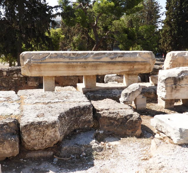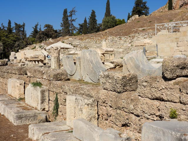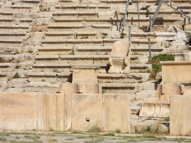 Wednesday morning we booked a walking tour of the Acropolis. It was a three hour tour that started at the ungodly early hour of 10 a.m. We took the metro the Akropoli stop and met our tour guide there. The group was about 20 people, mostly Americans. Our tour guide spent the first few minutes warning us to be care of everything; the heat, the sun, the steps, the slipperiness of everything due to the dust and marble walking surfaces, pickpockets and other criminals. The Acropolis is the ancient citadel that stands on the hill overlooking the city. On its grounds stood a number of temples, meeting halls and theaters. Our first stop was the Theater of Dionysus. It was built around 500 BCE and could accommodate 25,000 people.