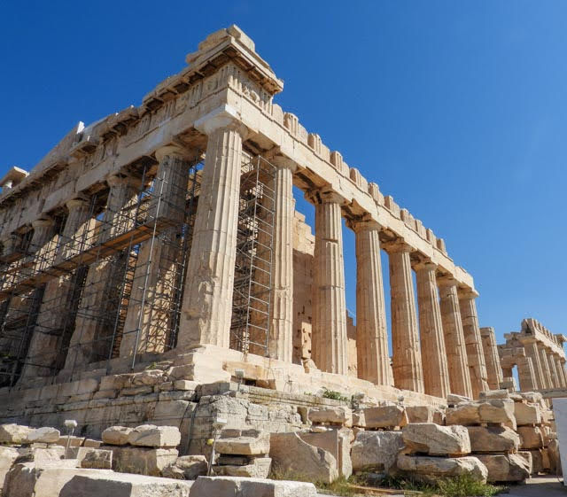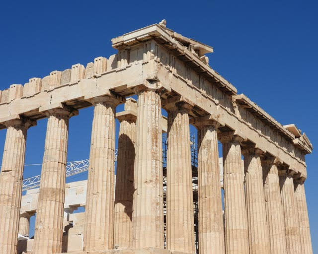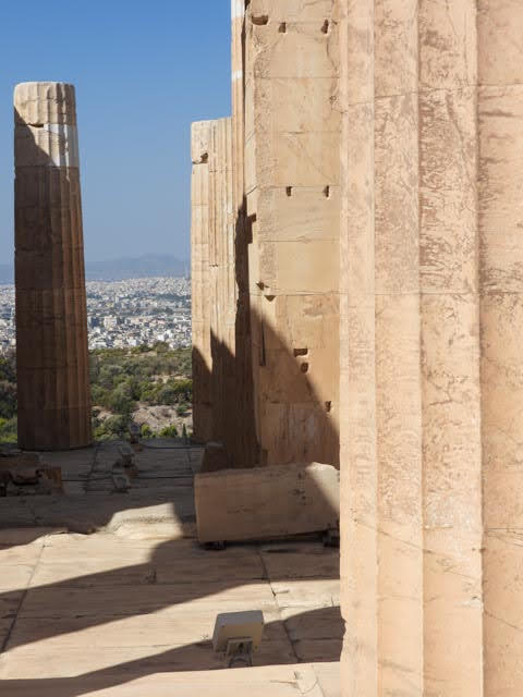 Our second stop was the theater or Odeon of Herodes Atticus. It was built in 161 CE and is still in use for concerts. We (that is the imperial we, meaning Sue) looked into getting tickets but could not manage it (the season was over) — maybe next time we are here. We then started walking up the steeper portion of then climb (Guide: “Be careful! Be careful! this next section is very slippery! I know many people who have fallen! Especially coming down!!!”) where the stairs narrowed and the number of people increased. We reached the Propylaea, or the main gate of the Acropolis, along with about 5 million other tourists. It is hard to get an appreciation of the 2,500 year old structures when you are pushing an shoving among a sea of people. He’s only exaggerating a tiny bit. Once through the gate, we moved around the Parthenon and, thankfully, due to the size of the grounds, the crowds thinned out.