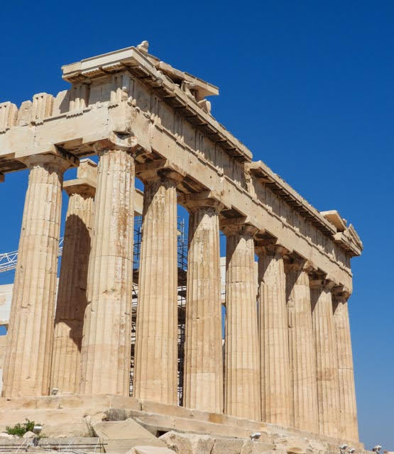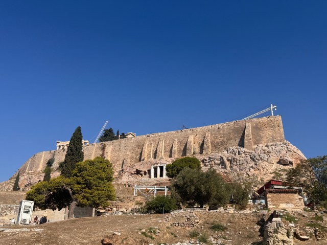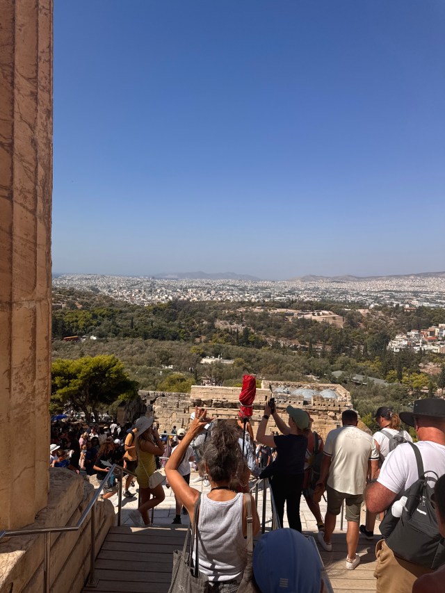 We took lots of photos and learned about its history. The short version is that it was built in celebration of the goddess Athena in the 5th Century BCE, then converted to a church when Christianity spread to Greece, then became a mosque when Ottomans ruled Greece. In the 17th Century, the Turks and Venetians fought over Athens. The Turks decided to store munitions in one part of the building which the Venetians then bombed, destroying much of it. In the 19th Century, the British came and took anything that was still there and put it in the British Museum in London and won’t give it back. It seems that the Greeks are unhappy with that.