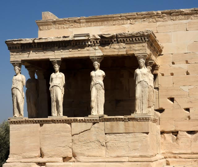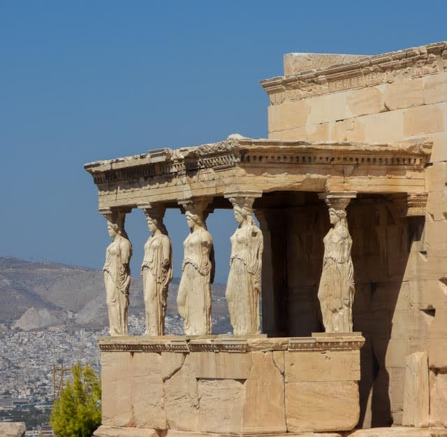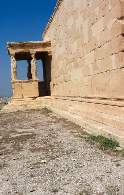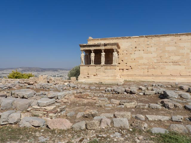 We walked over to the Erechtheion, which is a temple that was dedicated to Poseidon and other gods. According to our guide, Poseidon and Athena both wanted to be the god of Athens. They each provided a gift to the city in a bid to be god. Poseidon offered seawater, while Athena offered an olive tree. I could be a god just for an olive tree? I want that deal! The people of Athens chose Athena because they could see the use of the olive tree, but not the seawater. So, Athena got the Parthenon, while Poseidon (and the other gods) got the smaller Erechtheion. It contains “The Porch of the Maidens” where six “maidens” hold up the roof of the porch with their heads. The originals are in the Acropolis Museum, except for one which was — all together now: Stolen by the British with the express permission of, who else? The Turks!