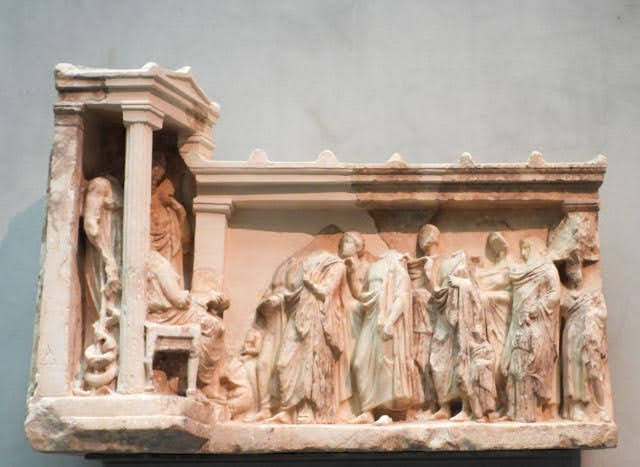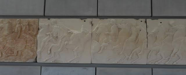 We climbed down off the Acropolis (Guide: “Be careful! Be careful! this next section is very slippery! I know many people who have fallen! Especially coming down!!!”) and headed to the Acropolis museum. At the south base of the Acropolis, the Greeks spent €150million to build a start of the art museum to display the artifacts of the Acropolis. It is gorgeous museum and brilliantly designed. The top floor is offset from the rest of the building so that it mirrors the direction and size of the Parthenon. They have placed the pillars at the same spacing as the pillars of the Parthenon and have displayed copies of the marble frieze from the top of the Parthenon (Guide “The British promised that they would return it once we had a safe place to display them so we built this gorgeous museum…but you can see they aren’t here.” If the British had to give back everything they plundered, their museum would be empty.) In the photo below of the frieze , you will see one that is more weathered, that is an original, the white ones are reproductions of the ones in the British Museum. Can you believe the are still in the British Museum even after we spent €150 million building this beautiful home for them?