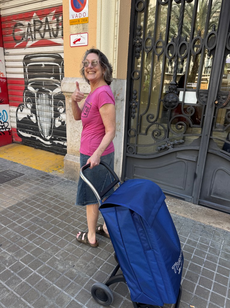 We had a short nap, unpacked and then set off to do the important things. First thing was find the grocery store, which is about half a block away. We bought some necessities and had something to eat. Afterwards, we headed out for a short wander and to look for the most import thing on our shopping list—a grocery cart for Sue. Ever since we went to Paris and Sue experienced the joy of Paul’s shopping cart, she has secretly (ok, not secretly) yearned for one of her own. Everywhere we went she critiqued the carts we saw and longed for the day she could have her own. We headed to El Corte Inglés (a big department store with one building for fashion and one for housewares) and made Sue a happy woman. (It is a most excellent cart!)